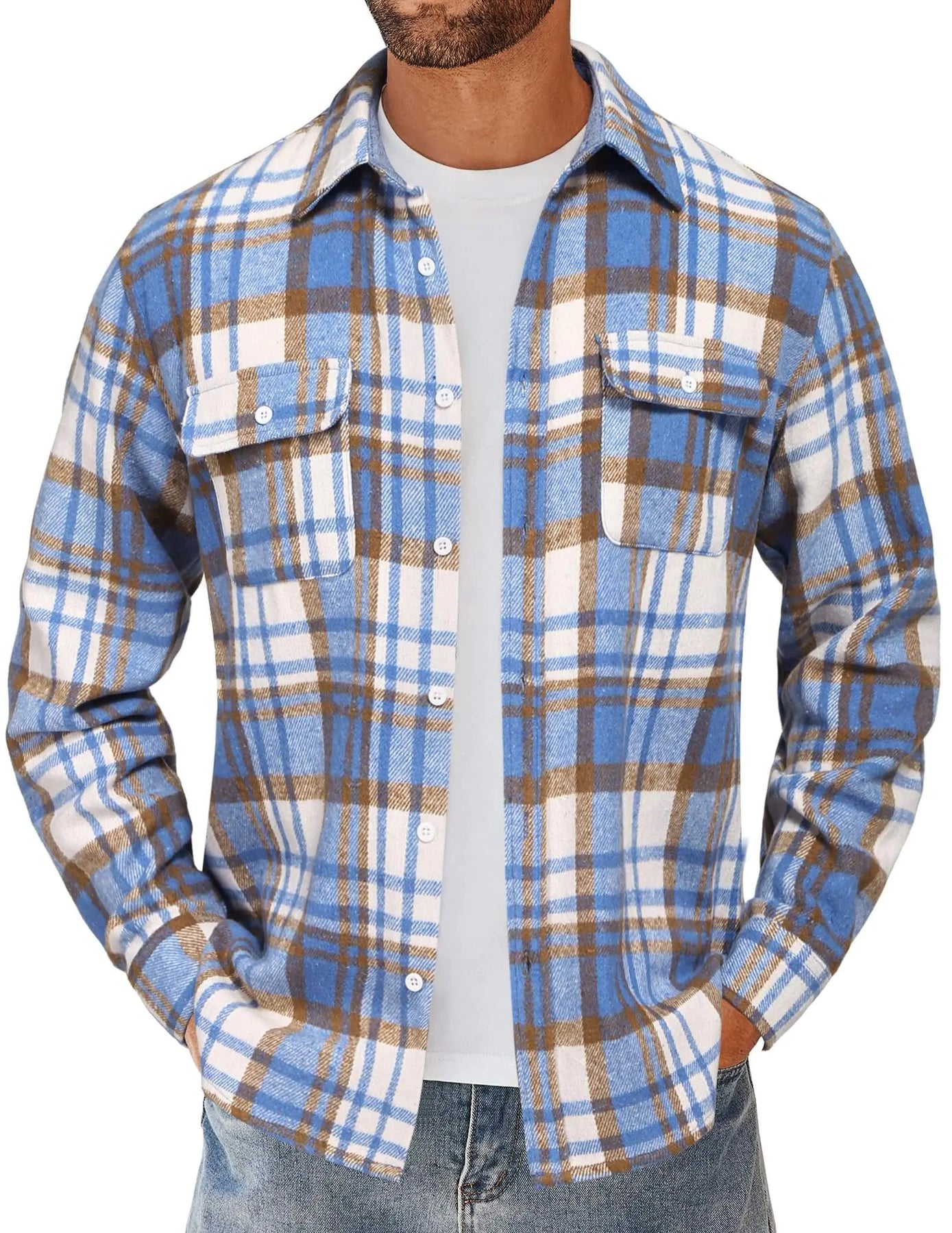 [Premium Fabric: Mens Flannel Shirt is made of premium cotton material that is comfortable warm lightweight skin-friendly and durable; the fabric is brushed to provide an extra layer of warmth and a velvety touch against the skin Stylish Design: Plaid Shirt Jacket features with long sleeve spread collar button down closure chest pockets adjustable button cuffs and plaid pattern; lined cuffs and collar can enhance durability ensures the collar and cuffs maintain their shape Collocation: Casual Flannel Shirt is suitable as a work shirt or daily wear in fall winter and spring; this shirt brings a timeless appeal to any casual outfit; you can match with t-shirts hoodies sweaters casual pants or jeans for a versatile look "Occasions: Flannel Button Down Shirt is suitable for many occasions; such as casual wear work outdoor activities office school holiday vacation night out and more; mens long sleeve plaid shirt is a nice gift for your father son or boyfriend" Warm Tips: Machine wash for Mens Flannel Long Sleeve Shirt; please refer to our size chart carefully before you ordering]