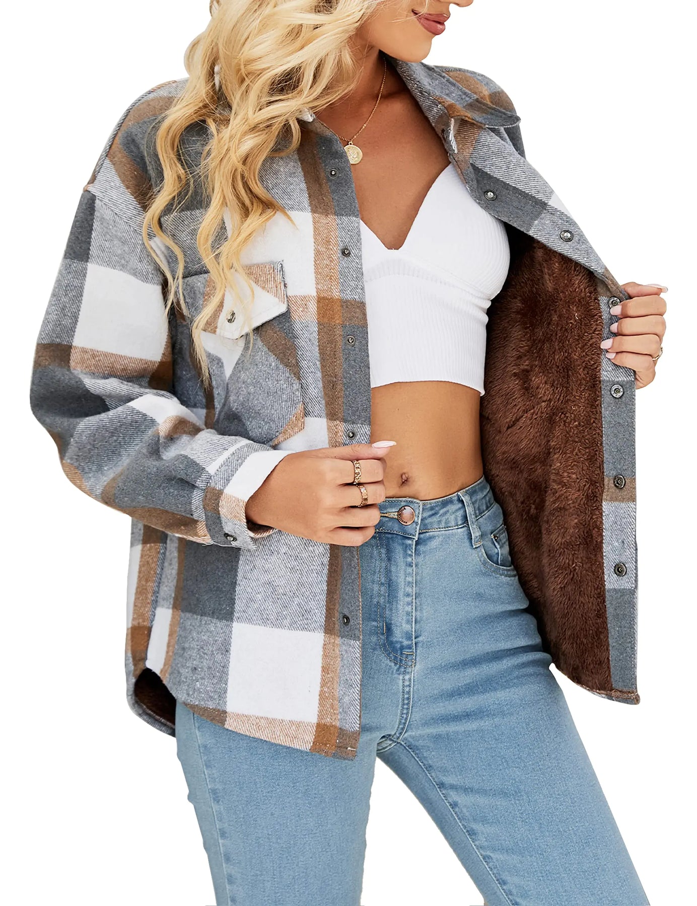 [Snap button closure Long sleeve fully fleece lined sherpa jacket with 2 flap chest pockets fleece lined include sleeves super warm and comfy button cuffs turndown collar full front button down Trendy and classic thermal woolen blend thick fall winter lannel shacket jacket easy pair with your sweaters jeans and boots soft and comfortable to wear all-round protection against chilly wind Regular fit soft fleece gingham pattern flannel shell and soft sherpa lining windproof jacket great for daily life home leisure outdoor travel this wool blended short pea coat make you stylish and unique All items are US SIZE machine wash cold do not bleach hang to dry if you have any concerns please leave it in Customer Q&A we will reply you ASAP]