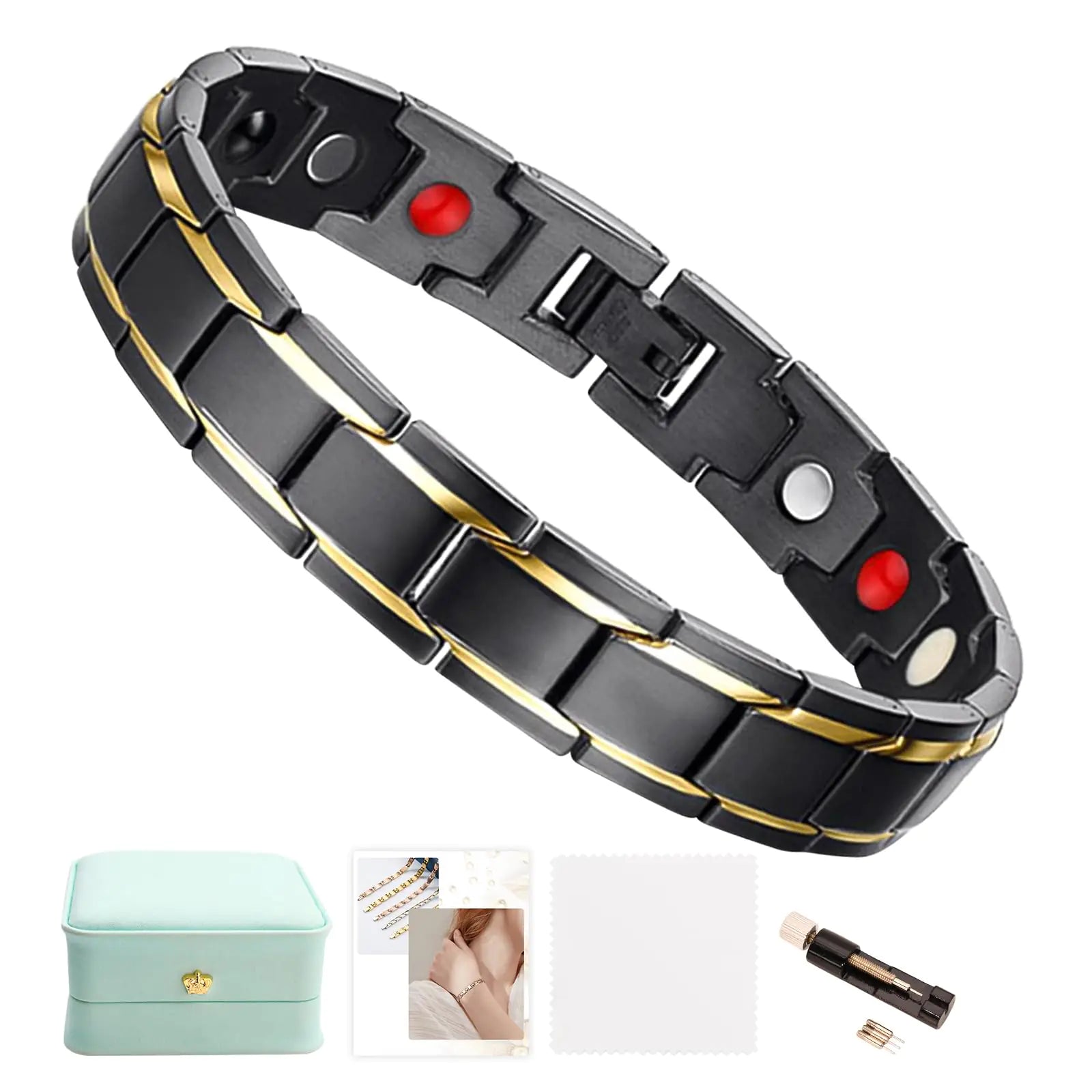 ["Unique Design: QIAOZILI Jewelry fashionable and minimalist style magnetic bracelet inlaid with 11 super-strong neodymium magnets each magnet is 3500 Gauss very suitable for daily dressing. Dont worry No one would know its a magnetic therapy bracelet." Material and Craftsmanship: Crafted from premium stainless steel meticulously polished and hand-finished with a mirror-like shine this bracelet resists fading while blending fashion with utility guaranteeing high quality and durability. Adjustable Size Design: With a length of 21 centimeters (8.3 inches) a width of 1.27 centimeters (0.5 inches) and weighing 70 grams per piece the bracelet boasts moderate dimensions and lightweight. It comes with an adjustable tool for personalized resizing ensuring both comfort and fit. Fashionably Versatile: Featuring a 10-millimeter-wide chain design Whether worn alone or paired with a watch or other accessories it showcases your personality and taste. This healing bracelet leaves a lasting impression and becomes a valuable addition to your wardrobe. "Thoughtful Gift: Suitable for both women and men this magnetic bracelet makes a considerate gift choice. Packaged in a gift box it expresses care and affection on occasions such as birthdays Christmas anniversaries Mothers Day and Valentines Day."]
