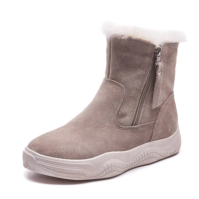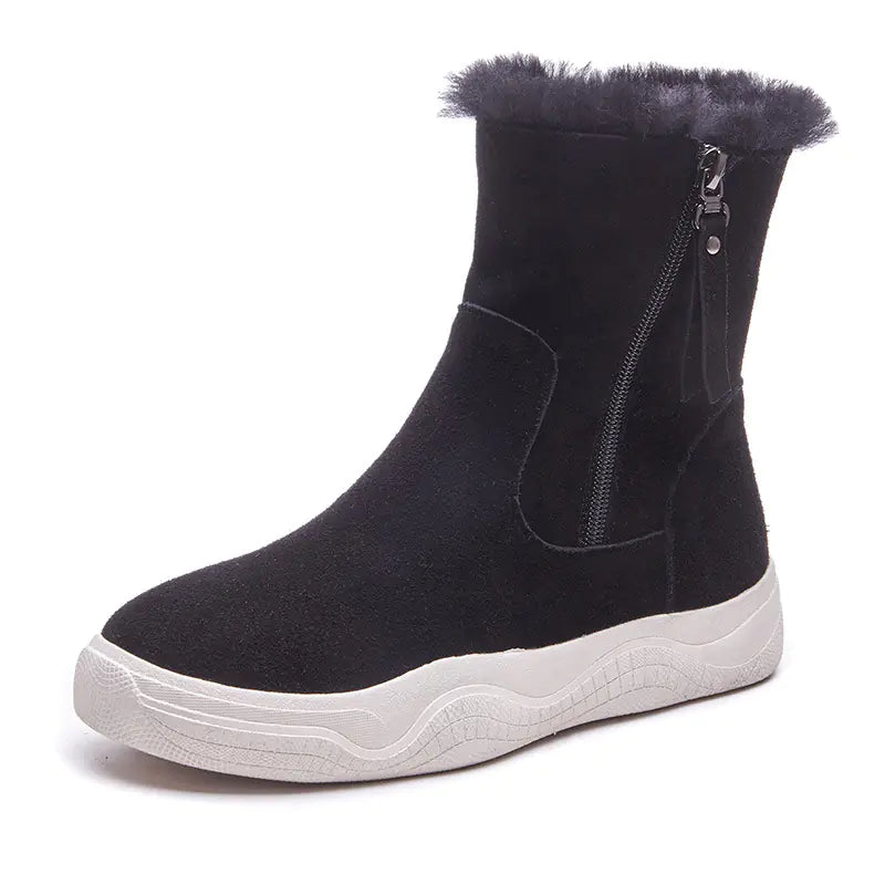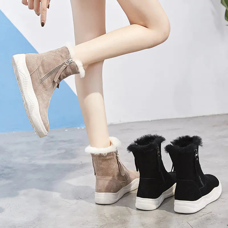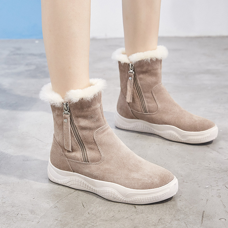 The exterior is crafted from soft suede, providing a luxurious feel while ensuring durability. With a flat rubber sole, these boots offer lightweight support, making them ideal for all-day wear. The cotton insole adds an extra layer of comfort, keeping your feet warm and cozy in the coldest weather.