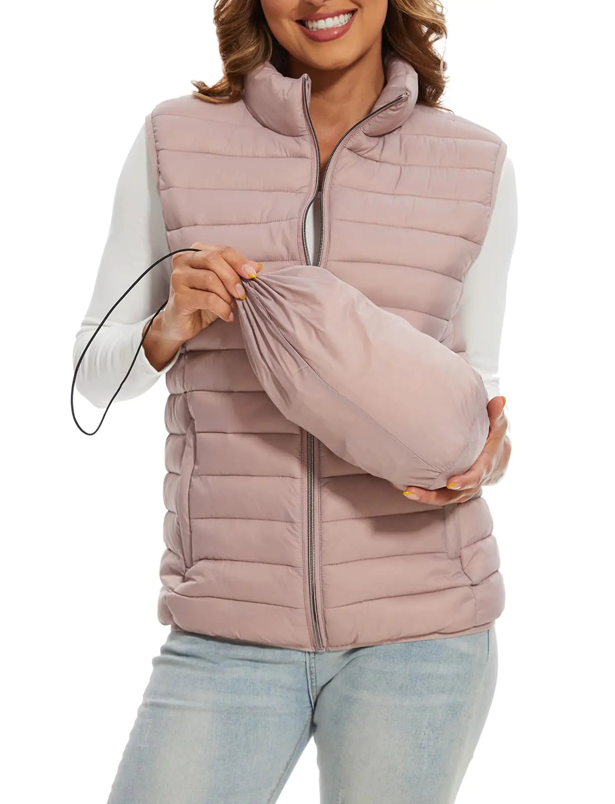 [Lightweight but Warm: Plain weave shell fabric in 100% Nylon filled with breathable and ultra-light recycled material. Fully lined quilted and insulated. Designed to keep you extra protected for the coldest winter days "Water-Resistant Packable Puffer:This ultralight packable puffer vest is a nylon shell construction that is durable and water resistant. Its easy packability makes it the perfect on the go vest" 4 pockets : 2 side-entry pockets with zipper for added security 2 large interior pockets for easy storage Details: Features a classic quilted pattern flattering seam details for the perfect fit front zipper closure zip pockets stand collar and packs neatly into included carrying bag Multipurpose: Suitable for most occasions such as hiking golf travel or wearing as casual]