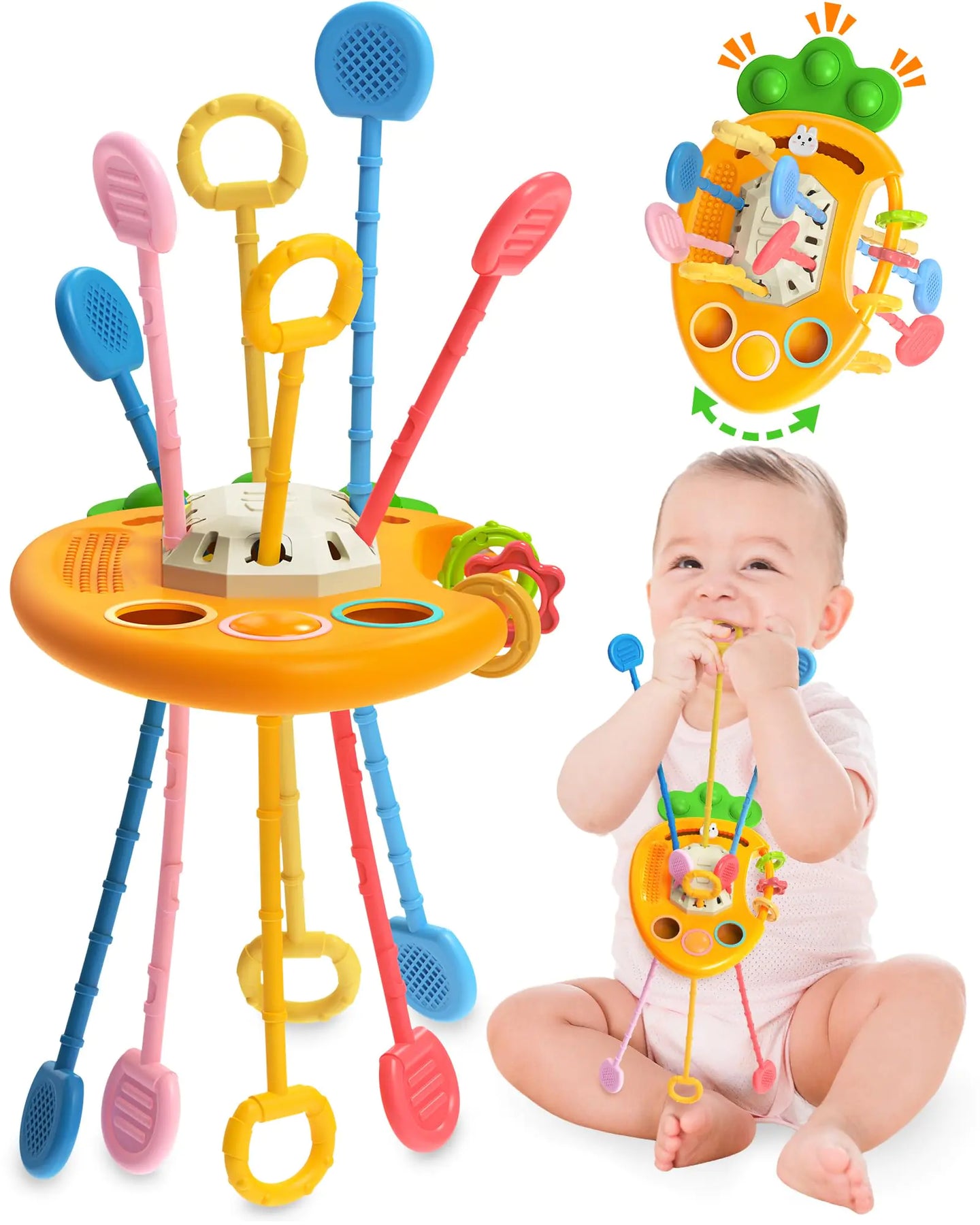 ["Fun Montessori Toys : This toy is amined for improving babys sensory ability and motor skills. With colorful soft up-down button it can attract baby to touch and press which stimulates toddlers curiosity and exercise their flexibility of small fingers. Moreover the textures on the ropes and rope ends are also varied so baby can pull all ropes through one side to the other to feel their differences. It is a great way to cultivate touch sensory color recognition and motor skills" "Develop Fine Motor skills: There are 6 strings of different shapes and colors some are easy to pull while others are more chanllenging which can better strength babys motor skills and improve their hand-eye coordination. Also for it is set with different difficult levels the baby toys can keep baby occupied and entertained for a longer time to explore cause and effect which will free parents from babys crying and enjoy their family time." "Baby Teething Toys: This toy is made with ABS and food grade material BPA free it can relieve the discomfort of babys teething gums and help babies develop chewing skills. 100% safe material no annoying smell and non-toxic for kids. Easy to clean and storage. The teething toy has no small parts and its surface is smooth and soft it keeps your 1 2 3 years old boys and girls play safely" "Best Travel Toy for Toddlers: The sensory toy is designed with octopus shape and portable size coming with ring-shaped bells the string will produce sounds when be pulled so it is interesting and convenient for baby to play it in cars trains and airplanes. Best Trave toy for toddler 1 spending long and boring time. Not only for up-down pulling and pressing the baby toy can also be used as bath toy teeth toy etc. More playing ways are waiting for you and your babys searching!" "Perfect Baby Toy and Gift: Our baby toy would be a wonderful choice for your baby as a Birthday gift Easter gift Christmas Stocking Stuffers Childrens day Valentines day gift and even a daily award. The brain-development sensory activity toy will bring happines for children enhance parent-child relationship help children become smarter more imaginative and creative so it would be a perfect toy/gift for baby girls and boys."]
