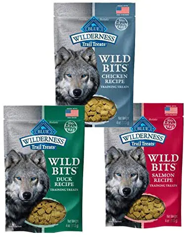 A perfect complement to the Wilderness foods BLUE Wild Bits treats are packed with more of the real salmon your dog loves. A healthy nutritious treat that starts with real meat these meaty Bits are the perfect way to reward your four-legged friends. Nutritious and grain-free BLUE Wild Bits contain only the finest natural ingredients and are loaded with healthy ingredients like: - Salmon-a high-quality protein source - DHA-to help support a puppys cognitive development - Omega 3 & 6 Fatty Acids-to help promote healthy skin and coat BLUE Wild Bits contain NO artificial flavors colors or preservatives so you can reward good behavior with a treat thats made the way nature intended. With this Wilderness Wild Bits Variety Pack Youll Receive: - (1) Wilderness Wild Bits Chicken Flavor - (1) Wilderness Wild Bits Duck Flavor - (1) Wilderness Wild Bits Salmon Flavor