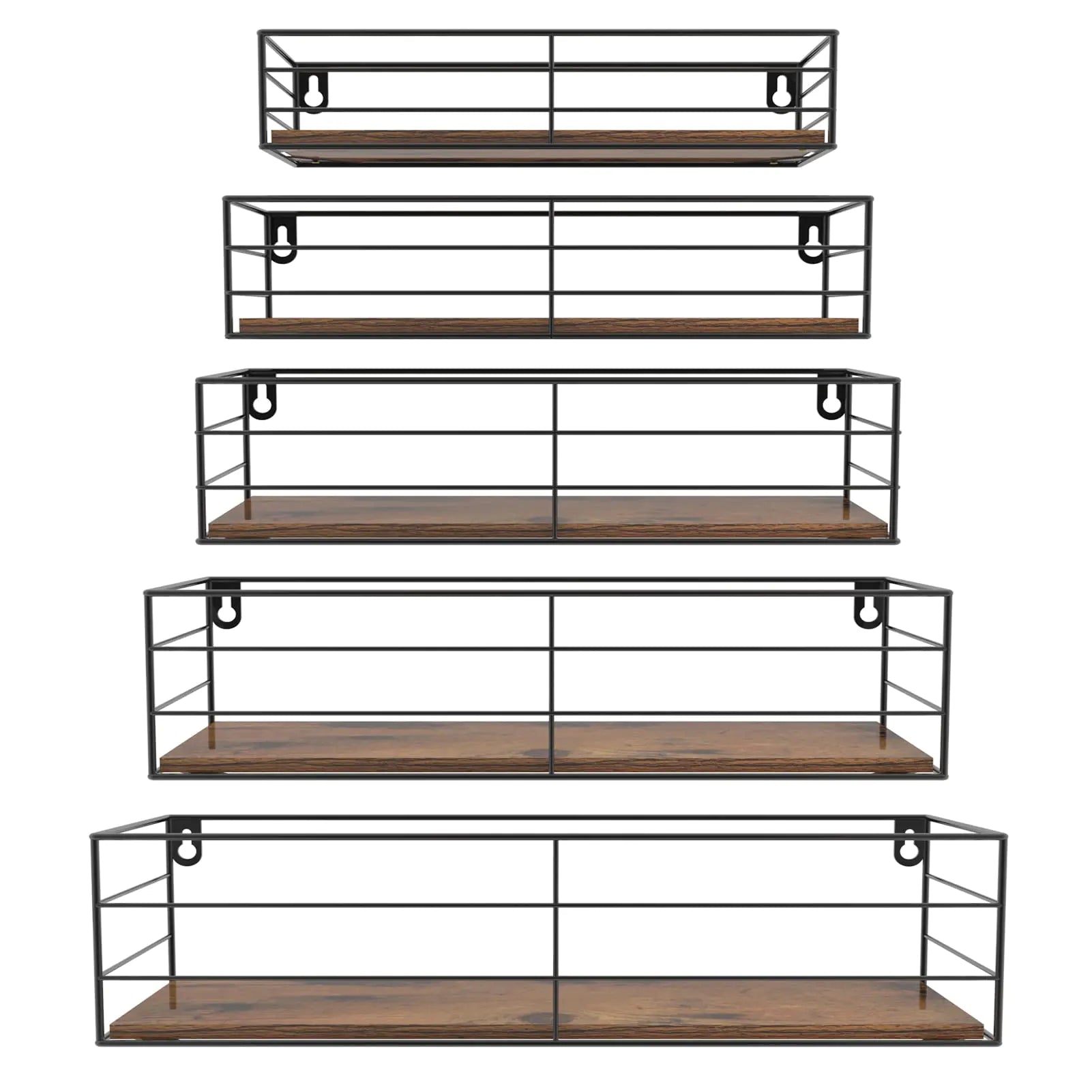 [Multifunction Wall Shelves: 5 different sets of floating shelves meet your storage need at one time. You can put them in Bathrooms Living rooms Bedrooms Kitchens Laundry Rooms Garage Office Bar Cafe houses. Decorative Floating Shelves: Each sturdy MDF wood board is different with a natural look. Combined with Brief and geometric brackets they are giving a rustic and modern look that adapts themselves to the environment easily and brings your wall to life. Thoughtful Protection: Floating wall shelves are specially equipped with railing in the front to protect things from falling for years. With protective railing you can also take things out of floating shelves arbitrarily without worry. "Easy to Assemble: Wood boards are pre-installed on the bracket. All necessary hardware is included. You only need to install floating shelves on the wall. It wont take you much time." Multi-sized Bathroom Shelves: The 5 floating shelves have 5 different sizes to fit themselves into your home flexibly. The largest one is 16x5.4x4.3 inches; The second largest one is 14.7x5x3.8 inches; The medium one is 13.4x4.5x3.3 inches; The second smallest one is 12x4.1x2.9 inches; The smallest one is 10.7x3.8x2.4 inches.]